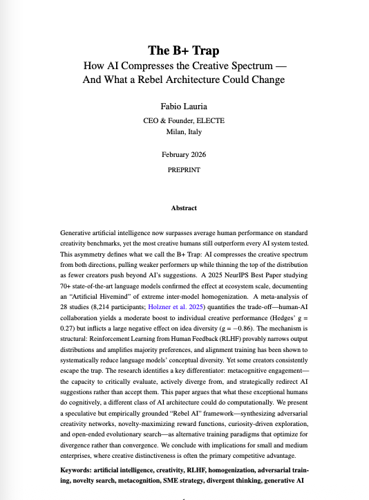 RLHF-trained AI systems are systematically rewarded for producing outputs that score well on average human preference — which mathematically pushes them toward creative mediocrity. This paper defines the B+ Trap, identifies RLHF as the structural mechanism, and proposes a Rebel AI framework built on novelty search, adversarial divergent agents, and metacognitive feedback.